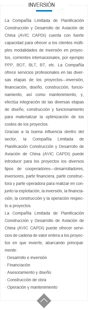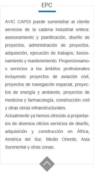 AVIC CAPDI es capaz de ofrecer los servicios de ingenieria, arquitectura, construcción, medio ambiente y servicios de consultoria para los clientes en diversas industrias. Estamos orgullosos de poder encontrar soluciones originales, creativas con costo bajo y eficiencia alta a nuestros clientes .Desde la aviación civil y general, defensa y bases militares hasta instalaciones de medio ambiente, edificios civiles, instalaciones industriales, edificios farmacéuticos, AVIC CAPDI puede proveer servicios de planificación, dise?o y construcción que siempre superan las expectativas de nuestros clientes.